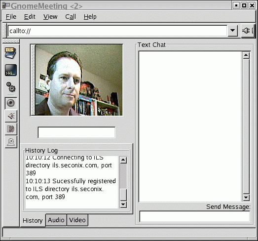 Notice the button bar to the left in Figure 2. You can turn your video or audio on and off, and you can bring up a chat window for text message exchange. If you have a microphone, GnomeMeeting will make use of that as well. In fact, GnomeMeeting will work under a number of different configurations. You can run video only, audio only, text only or any combination of the three modes. Of course, it can be a little disconcerting to know that somebody out there can see you, but you can't see them. Mon Dieu! Now I definitely need a refill. François, bring the wine. Vite!