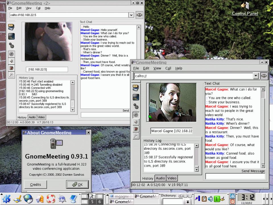 When you run GnomeMeeting, make sure you turn on the control panel. It opens up to a tabbed window in the application providing support for audio and video controls as well as a history window. This shows the status of calls, your registration with on-line directories and other information and can be turned on or off at any time without affecting the transmission. Figure 3 handily displays a desktop with two sessions running (it would appear that I managed to reach a cat).