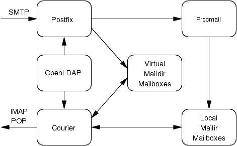Although this article provides instructions on setting up an integrated mail server using Postfix, OpenLDAP and Courier-IMAP, it does not discuss how these software components were chosen, which could be a whole article in and of itself. The goal is to set up an SMTP mail server for multiple domains on a single machine with remote access via IMAP. Also, instead of having mail delivered only to people with shell accounts, we want to have IMAP accounts that do not have a corresponding shell account. This gives rise to two classes of accounts: local and virtual. Local accounts are those with shell access. They use their shell user name and password to access IMAP. Virtual accounts have a user name and password that only works for logging in to IMAP. The terms local and virtual are used throughout the rest of the article.