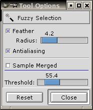Now double-click on the fuzzy select (magic wand) tool in The GIMP toolbox window to see the tool options. You'll need to experiment with the Threshold setting, but generally you'll want to increase it from the default. Try the value I used here, shown in Figure 4. You also should check the Feather option and give it a small amount, as shown.