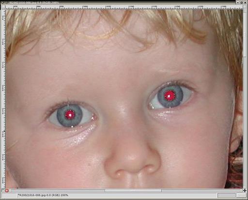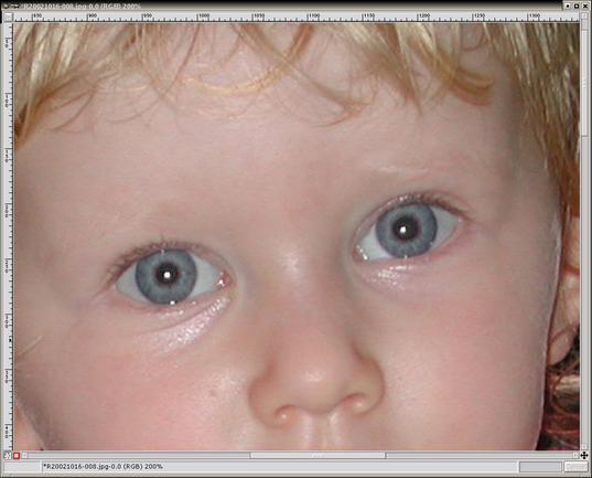 Here's the technique. Start The GIMP and load your red-eye image (RC-->File-->Open), as shown in Figure 1. Once you've got your image loaded, zoom in close on the eyes (by pressing + a couple of times and scrolling as necessary) so you can get a good, large view of the red pupils, as shown in Figure 2.
