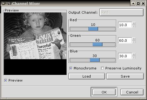 The Channel Mixer is a great plugin for converting color selections or entire photos to black and white, as it gives you a lot more control over the process than the Desaturate or RGB-->Grayscale conversions. The Channel Mixer wasn't part of my stock Red Hat-based GIMP 1.2.3, but I found it at The Gimp Plugin Registry (registry.gimp.org). Simply compile it and drop it in the .gimp-1.2/plug-ins folder in your home directory.