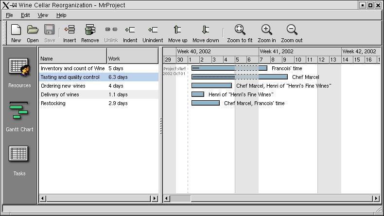 When you start MrProject for the first time, by typing mrproject &, you open up a blank project. You even can open multiple projects by clicking on New. Notice the buttons on the left-hand side: Resources, Gantt Chart and Tasks. Switching from one view to the other is as simple as clicking the buttons.