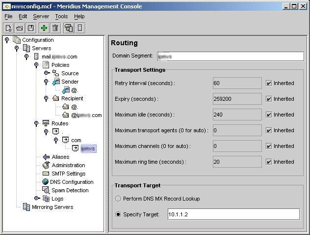 The first-time configuration of mail policies is performed using a wizard-like tool. The wizard was enough to get a small organization like mine up and running. The console is used for advanced configuration, such as routing mail within an organization or within an ISP. Policies also can be configured to refuse mail based on IP address, domain or e-mail address. E-mail aliases for individual users also can be created and maintained in the console. All of these settings, familiar to a mail administrator as part of the configuration files, are easily set and modified in the Meridius console.
