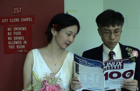Beauty or LJ: Bride-to-be Qing Xiang peeks at fiancé Ning Qian's Linux Journal (photo: Nicole Xiang).