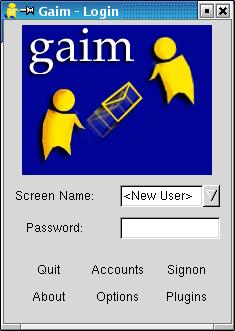 The first time you start up Gaim, you'll get a simple window with text fields for Screen Name and Password. The Screen Name field will have the words <New User> entered letting you know you don't have any accounts set up. Obviously, mes amis, before we start using instant messaging through Gaim, we will need at least one account, non?