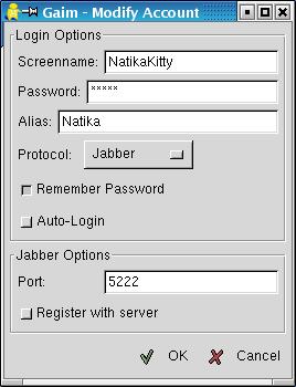 Enter your Screenname, Password and Alias, then click on the Register with server radio button. If you would like your Gaim client to log in to Jabber automatically every time you start up the client, click on the Auto-Login radio button as well. When you are happy with your changes, click OK. Your Account Editor window will show your new account (Figure 3).