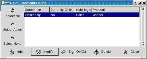 It is entirely likely that you already have a fine Jabber IM client loaded on your system. It is called Gaim. It was originally written by Mark Spencer and is now maintained by Rob Flynn (with the help of the usual band of dedicated coders and patch writers). We will be using Gaim to set up a Jabber account, but Gaim also can talk to AOL's instant-messaging client, and Yahoo's client, and Microsoft's MSN client and others as well. This multiprotocol support is achieved through the use of plugins, making Gaim one of the most flexible instant-messaging clients around.