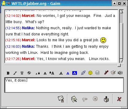 While François is off to get the Champagne, we'll finish up our examination of Gaim. Once all this accepting has taken place, your buddy will appear on your buddy list. An icon beside the name on your buddy list will indicate whether your buddy is on-line. If so, double-click on the name and start chatting. It is that easy.