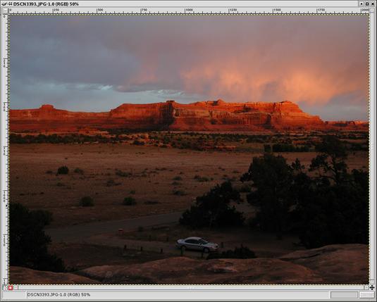 Let me illustrate with the following example: a Utah sunset, shown in Figure 2 loaded into a GIMP window. I had followed the sage advice and exposed for the clouds and highlights on the cliff face and allowed the foreground to go quite dark. Using the LAB decompose plugin, I can decompose this RGB image into the LAB constituents. Of these, the L channel shows the full range of luminance values carried in the image. As you can see from Figure 3, there is a considerable amount of detail in the foreground trees, which in the original image look almost completely blocked up. This is good, but how do I pull out this detail, while retaining the beautiful detail and color of the cliffs and clouds?