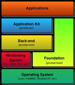 GNUstep also offers a well-defined separation between the user-interface classes (part of the application kit) and the underlying windowing system. This layer, called gnustep-back, provides implementations for various windowing systems, allowing gnustep-gui to work properly under various back ends. Back ends currently are being developed for the X Window System, Microsoft Windows and Ghostscript. Figure 1 shows the different layers of GNUstep.