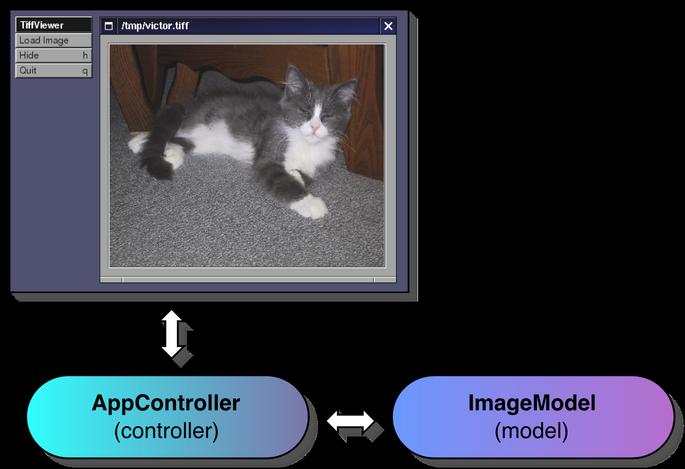 Now that GNUstep and Gorm are compiled and installed, you can develop your small application, a simple TIFF image viewer. This application will use the Model-View-Controller (MVC) design. The MVC design pattern separates a software component into three pieces: a model, a view and a controller. Figure 2 shows how the MVC pattern is used in our small application.
