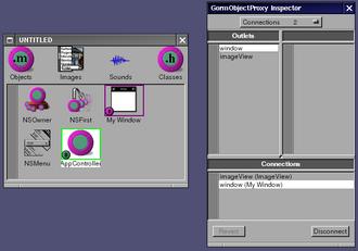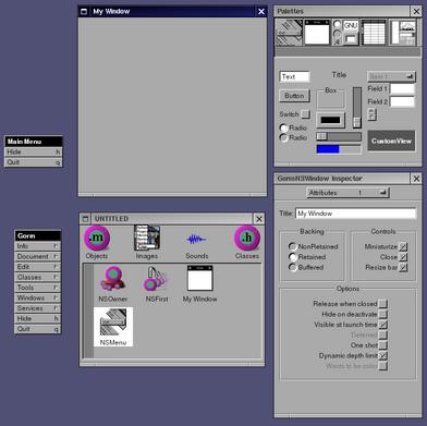 Under GNUstep, use Gorm to create the views of an application. This application allows you to create the user interface of your application. Once created, the user interface will be saved as an archive file (containing a serialized object graph) in its own subdirectory. To start Gorm, simply type: