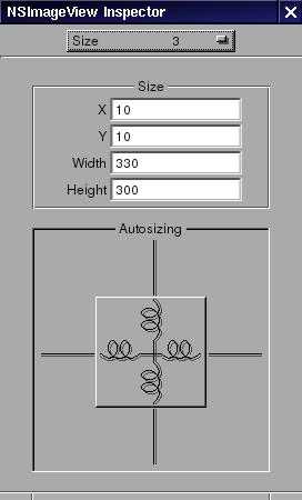 Now, from the Inspector window, select the Size item from the combo box at the top to set the auto-sizing properties of the NSImageView object. Setting the auto-sizing properties to NSImageView will allow the object to resize properly if the user resizes the window. Set the parameters by clicking on the lines inside the Auto-sizing box to look like those in Figure 6.