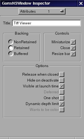 Next set the window attributes. Click on My Window in the File window. Set the title to Tiff Viewer in the Inspector window. The Inspector window for the attributes should look like Figure 7.