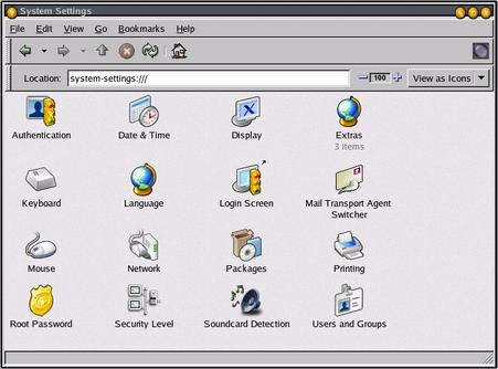 Clicking on the Network icon in the System Settings window will open a utility (neat) for configuring network cards and the hosts file. The printer utility (printconf-gui) allows the user to add printers, set print drivers and restart the printer dæmon.