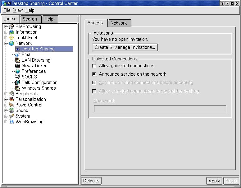 Enter KDE Desktop Sharing from creator Tim Jansen. The package is scheduled to be part of the standard network offerings in KDE 3.1, which may be out as we speak. Those running KDE 3.0 also can take advantage of this great package by visiting Tim's site, www.tjansen.de/krfb, and downloading the latest source.
