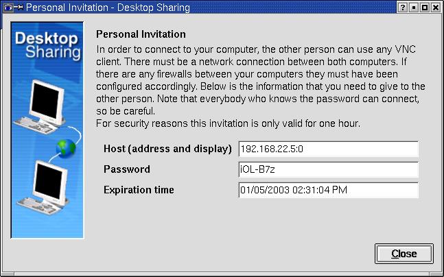 For security reasons, the invitation itself lasts for only an hour. If you don't do anything else, Desktop Sharing automagically comes up with a password and an expiration time for the session. The host address necessary for the connection also is displayed. Overriding either the password or the expiration time is not allowed. Make sure you pass on the information as it is shown to the person who will be connecting. When you have passed on the information (or written it down), click Close.
