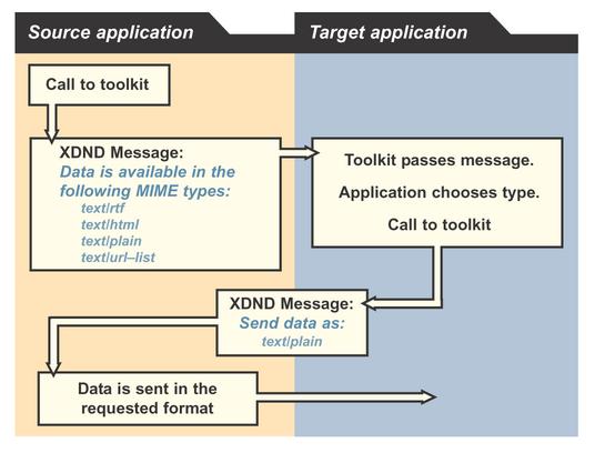Figure 1 shows how XDND works. When an application must send something to another one, it issues the proper toolkit call. The toolkit sends everything, through the XDND protocol, to the other toolkit, and the answer is passed back to the program in the same way.