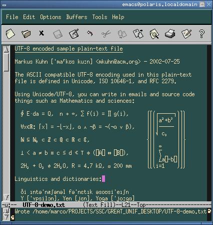 The character encoding that is becoming the standard on Linux is Unicode UTF-8 [see “Unicode” by Reuven M. Lerner in the March 2003 issue of LJ]. The good news is that it can represent all characters existing on the planet, so no other encodings are necessary. Figure 4 shows Emacs, as packaged in Red Hat 8.0, dealing with all kinds of symbols and characters. The bad news is that because non-ASCII characters take more than 8 bits and sometimes much more space on screen, many deeply ingrained dogmas, starting with the equation “1 character = 1 byte”, simply disappear. The right resources to deal with this, apart from the Linux Unicode HOWTO, are the mini-guide to “UTF-8 soft and hard conversion” and the UTF8_STRING mechanism that aims to preserve the X cut-and-paste system in a UTF-8 world. At a higher level, programming for internationalization, regardless of the operating system, is the goal of Openi18n.org.