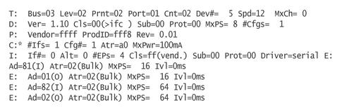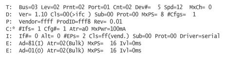 If a device has more than one bulk IN and bulk OUT pair, multiple ports are assigned to the device. For example, a device with the endpoints as described by /proc/bus/usb/devices (Figure 2) shows up as a two-port device and produces the following kernel messages when plugged in: