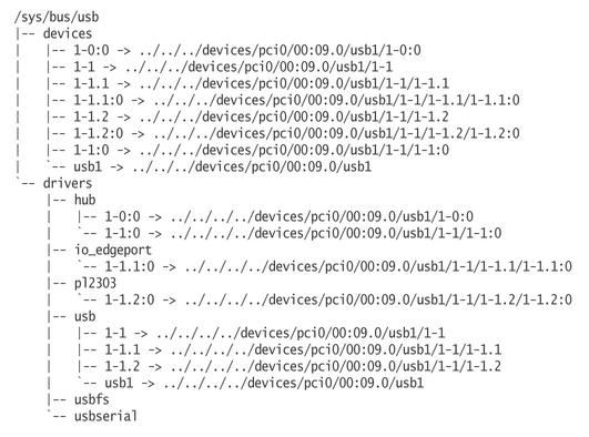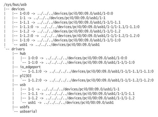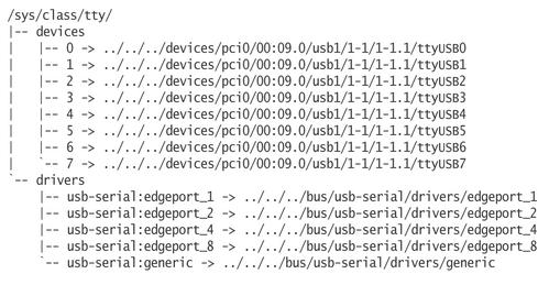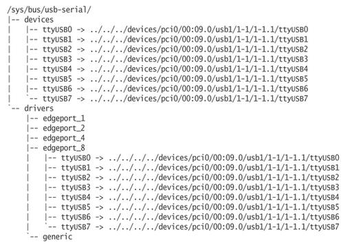The dev file contains the major and minor number for this specific device, which then can be used to determine the proper device node for talking to it. In the /sys/bus/usb directory, this USB device is seen as being bound to the io_edgeport USB driver (Figure 3).