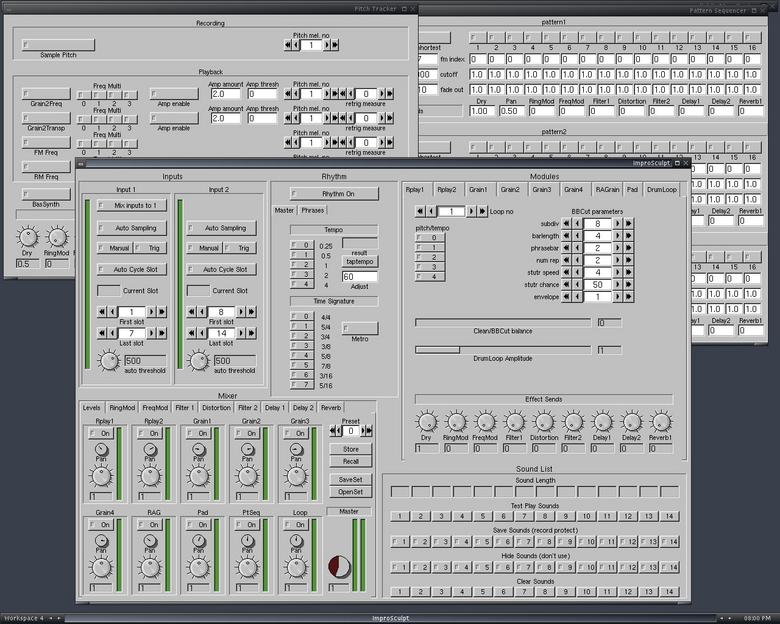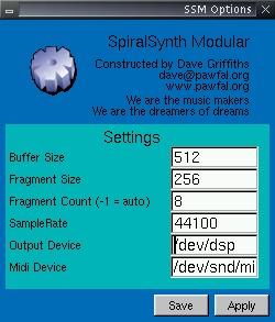 Dave Griffiths has thoughtfully provided some excellent demos of the synth on the SSM home site. Its FLTK interface is pleasant and easy to use, the program includes a generous share of interesting and useful modules, including LADSPA support, and the latest version can be built with support for JACK. Dave plans to include a much-improved plugin version of SpiralLoops for a soon-to-arrive version of SSM, and we can expect more direct support for ALSA as well.