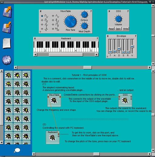 Figure 3 shows off SSM running its first tutorial patch. This example shows a simple type of synthesis called wavetable synthesis. The wavetable is a predefined stored waveform (sine, square, triangle, pulse, etc.) that is triggered by the virtual keyboard and modified by the envelope generator before heading out to the sound card DAC through the OSS output module. In the example, we can see that the synthesizer is played through the computer keyboard, but SSM also provides a MIDI module for receiving and routing MIDI messages. The keyboard module is a nice touch, and I had great fun with it playing SSM from my laptop's QWERTY keys.