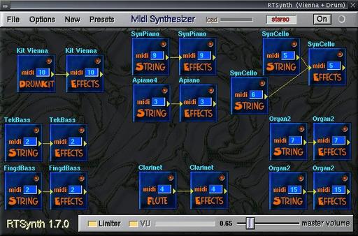 Physical modelling synthesis is capable of extremely realistic sounds. Some of RTSynth's patches are quite convincing. The examples on the RTSynth home page show off some amazing acoustic and electric guitar sounds in full arrangements with bass, drums and keyboards. RTSynth is a multi-timbral softsynth, complete with drumkits and effects processing, and the demos really showcase its capabilities as a single-solution softsynth.