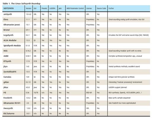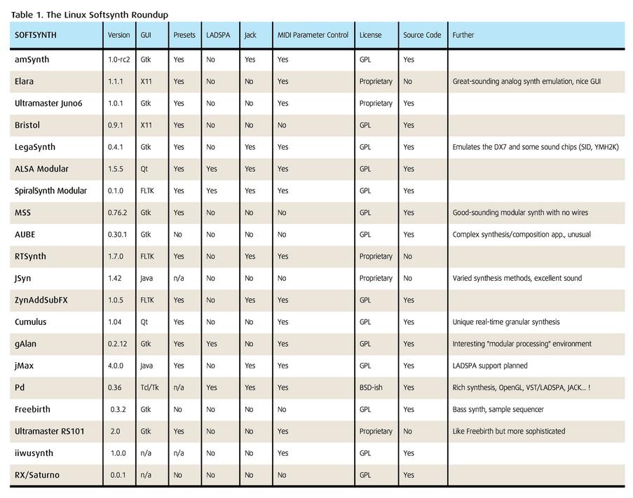 The Software Synthesis section of the Linux Sound & Music Software site includes a subsection of Softsynths & Samplers. More than 30 URLs are currently active, taking you to a variety of software synthesizers. Table 1 has pruned some of that variety by focusing on synthesizers capable of polyphonic (plays many notes at once) real-time output, ignoring off-line synthesizers and environments such as Csound or RTCmix. Due to their real-time nature, I have included beatbox programs and the MAX-like environments of Pd and jMax.