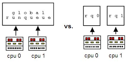 To solve this problem, the new scheduler divides the single global runqueue into a unique runqueue per processor. This design is often called a multiqueue scheduler. Each processor's runqueue has a separate selection of the runnable tasks on a system. When a specific processor executes the scheduler, it selects only from its runqueue. Consequently, the runqueues receive much less contention, and performance does not degrade as the number of processors in the system increases. Figure 1 is an example of a dual-processor machine with a global runqueue vs. a dual-processor machine with per-processor runqueues.
