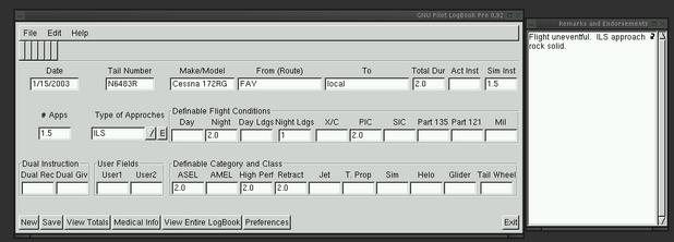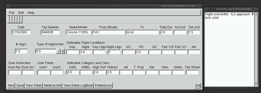 If you're a pilot, you know maintaining a logbook is not a big chore. But, when someone wants to know how many hours of which type you have, it becomes a little more difficult. This logbook is like the professional logbook for pilots with all the entries you'll need, plus two user-definable fields. With one click you can see all totals to date. And, by running a small script on the data file (you'll have to create that yourself), you can create a data file for 60 or 90 days back to see how your totals are for currency. Requires: libgtk, libgdk, libgmodule, libglib, libdl, libXi, libXext, libX11, libm, glibc, pilot's license and airplane (last two optional).