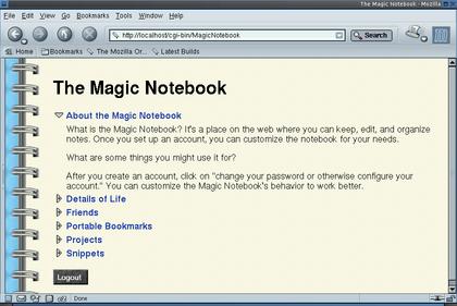 Using Magic Notebook is like keeping notes in a notebook, except you use a web interface rather than a pen or pencil. This program can be accessed from anywhere you can reach your web server and can be run normally or encrypted. The notes are stored on your filesystem as HTML files, so if you don't want to use the web interface, the notes are still there. Requires: web server that can serve up CGI scripts, web browser.