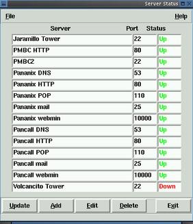 This is yet another program that allows you to keep an eye on servers and their status. Although it does require X, it's clean, fast and simple. A number of such programs require SNMP; however, this requires only basic network services. You can leave it running on any system with Perl and Tk and see instantly if you have a problem with a critical service. It won't send you e-mail, but it automatically updates every 60 seconds (configurable) and is easy to read. Requires: Perl, Perl modules IO::Socket, Tk, Tk::Checkbutton, Tk::Menubutton, Tk::Optionmenu.