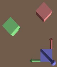 Figure 1. Behavior of xform. The axes are color-coded: +x = red, +y = green and +z = blue. The blue box was not transformed. The red box was rotated, then translated. The green box was translated, then rotated.