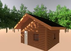 Figure 5. Perspective view of the cabin in daylight with some trees added for interest. Rendering at 3300 × 2200 for publishing quality took about five hours on a 1.7GHz laptop.