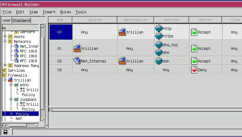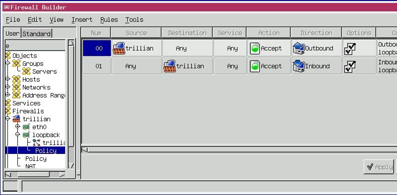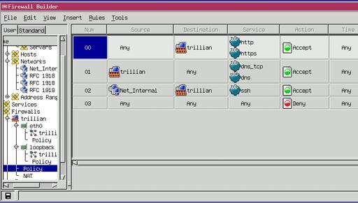 Suppose you've got a web server to harden, named Trillian. You've installed Firewall Builder on your administrative workstation; remember, we avoid running the X Window System and therefore X-based applications on bastion hosts. You've subsequently created some objects that describe hosts, networks and groups in your environment, plus a firewall object for Trillian, complete with a loopback-interface definition. In other words, you've done the things I described in last month's column.
