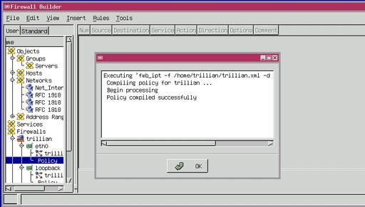Upon successful policy compiling, Firewall Builder writes a file whose name consists of the name of the firewall object whose policy you compiled and the suffix .fw. The example script we produced, trillian.fw, is shown in Listing 1. Listing 1 has been modified slightly due to space requirements, and some housekeeping material has been removed. All of the actual rules mentioned in the article are present.
