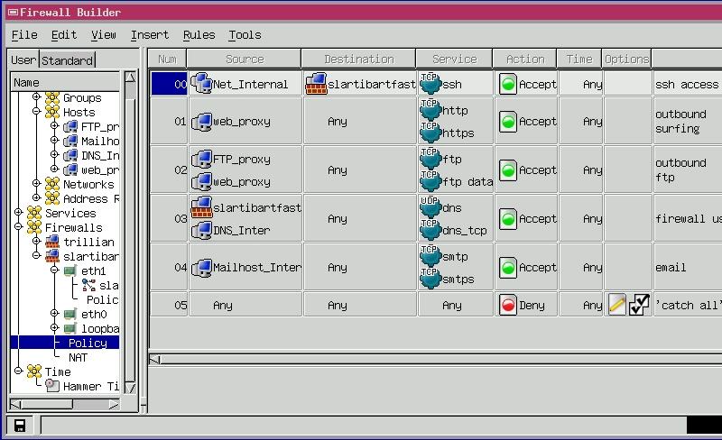 Figure 5 shows Slartibartfast's global policy; because this article is already too long I won't explain it in-depth. But the whole point of Firewall Builder is to display firewall rules in an easy-to-read format, so Figure 5 should be self-explanatory.