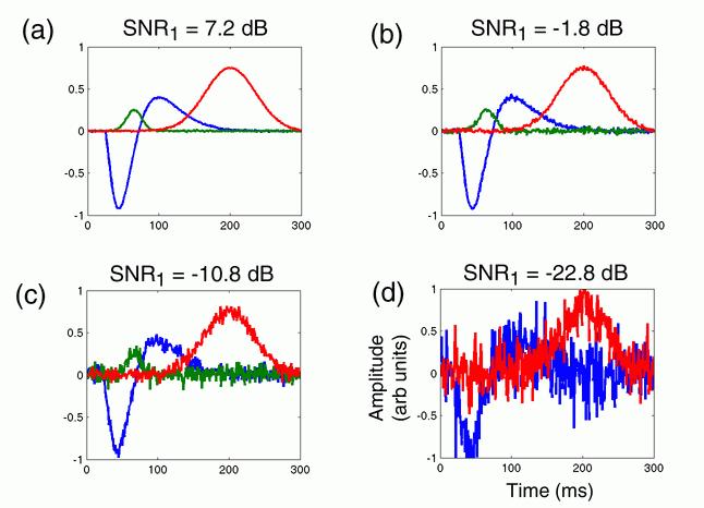 Figure 1 is an example output from the mcERP algorithm, showing estimates of the fundamental waveforms driving real-time potential readouts at scalp electrodes during simulated experimental trials. Each of these waveshapes is the result of many iterations of progressively accurate Bayesian waveshape estimation, requiring many calculations per iteration. These results can take many hours to achieve with Matlab but take seconds or minutes if portions of the algorithm are rewritten in C.