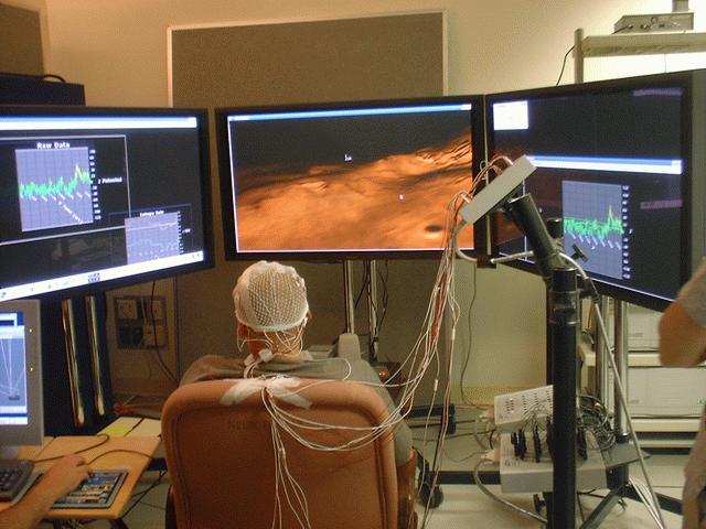 The photograph in Figure 2 shows our experimental setup for conducting experiments in brain-computer interface with real-time feedback. With the three large displays, we have complete control over what the subject sees within most of his or her field of view. All of the number crunching and display software was developed in-house and runs on Linux.