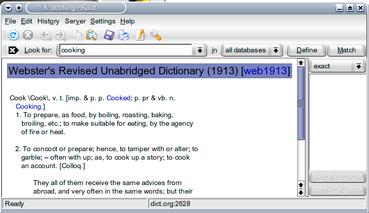 KDE has a nice, integrated dictionary application called Kdict, part of the kdenetwork package. You'll most likely find Kdict in your Utilities menu under the KDE application launcher (the big K). You also can launch it from the shell with the program name kdict (Figure 1). Enter and Kdict connects to various on-line dictionaries to pull up the appropriate definition. Those resources include the Merriam-Webster Dictionary, Wordnet, The Jargon File, The Devil's Dictionary and others.