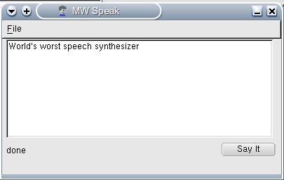 The data directory is where the wav files are stored. The GUI is simple. Type a word or phrase, click Say it and wait. I say “wait”, because MWSpeaker downloads each word's wav file in turn before playing your selection. The results can be a lot of fun because the voices saying the words aren't consistent. You wind up with a strange mix of male and female voices.