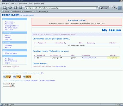 This Web help desk allows various levels of users, from clients to support personnel to site contacts to administrators, to track trouble tickets. The system is easy to set up and use. Each user can configure their preferences as needed. If e-mail support is desired, you'll need an MTA, such as sendmail, running on the system. Requires: Web server with PHP and PostgreSQL support, PostgreSQL server, Web browser.