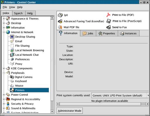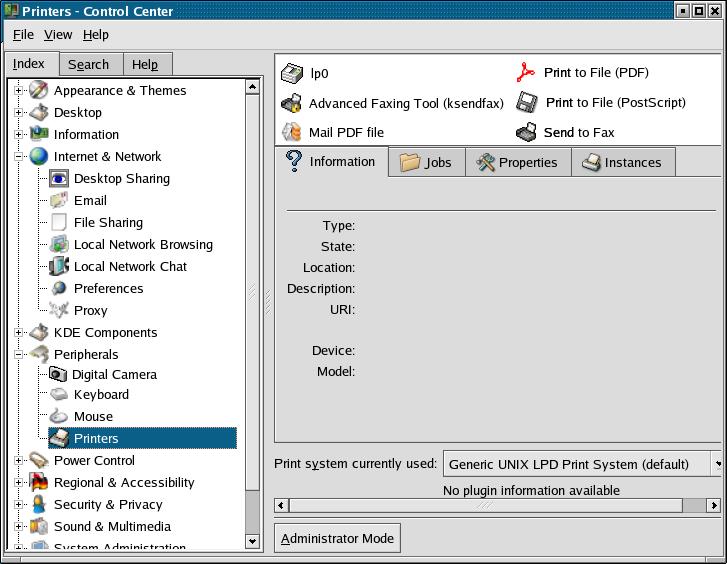 Under both GNOME and KDE, normal users can do everything they typically are allowed to do without problems. The only misconfiguration I found is shown in Figure 2. LPD is declared as the currently used printing system, although CUPS had been chosen. Everything printed fine, but the text is misleading.
