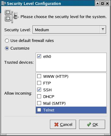 Red Hat provides its own set of system administration tools, most of them named redhat-config-* (simply type redhat-, then press Tab while logged in as root to see them all). All are documented in the downloadable or printed Red Hat manuals and are adequate for beginning and intermediate system administrators. Figure 3 shows the security/firewall tool, which is limited but sufficient for home users. The only problem found with other services is that the redhat-switch-mail tool would not work in the text version.