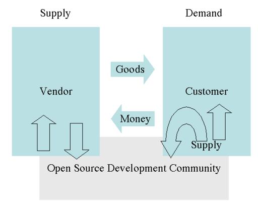 Figure 2 shows how the new marketplace looks. Here the demand side—the customer—is in a position to supply itself. It still buys goods from vendors. In fact, smart vendors' goods are improved by participation in the same development community as their customers.