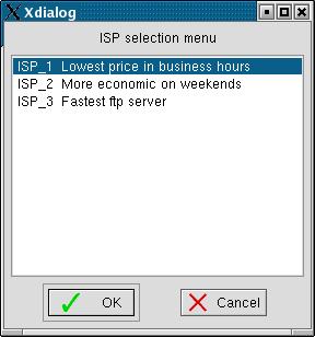 The first invocation (see Figure 1) allows the user to choose the best ISP. We also added some explanatory text (ISP selection menu) and specified the height (20) and width (40) of the window, as well as the height of each entry (5). In the case of Figure 1, after the user presses the OK button, /tmp/netsettings will contain this one line: