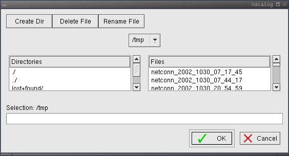 The second Xdialog command allows the user to type in an account name or to accept the default value (Figure 2). The last one (Figure 3), displays a file selection window in which one can type or select with the mouse the name and location of the current log file. At this point, all the user choices are in /tmp/netsettings, so we simply must source that file and launch the connection.