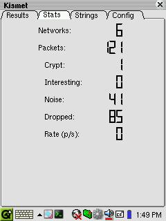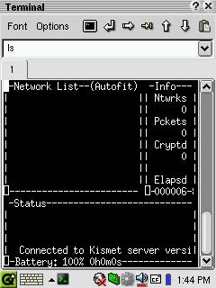 For a quick taste of the Kismet command-line interface, slide your wireless CF card into the CF slot and, from the terminal mode, enter kismet as root. Your network card will begin to flash rapidly, indicating that Kismet is sniffing for wireless networks by analyzing all packets it encounters.